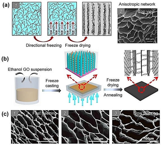 Figure 5. (a) Schematic of the microscopic sequences of directional freezing and top view of the final structure [59]. (b) Schematic of directional freezing of graphene oxide (GO) suspension and aligned graphene (GA) structure [60]. (c) SEM images showing vertically aligned graphene networks, fabricated through freeze-drying at different freezing rates, as indicated, and subsequent freeze-drying, captured from a top view [61]. Reproduced with permissions from refs. [59,60,61].