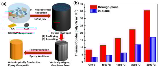 Figure 6. (a) Representative diagram of a conductive epoxy composite production enriched with vertically oriented RGO/GNP hybrid foam. (b) Thermal conductivity variation in the in-plane direction (red column) and in the transverse direction (blue column) of the epoxy composite incorporating the RGO/GNP hybrid foam aligned vertically at different temperatures. Adopted with permission from ref. [62].