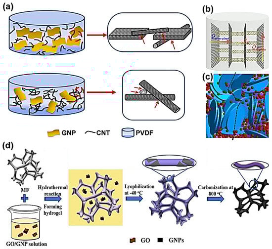 Figure 7. (a,b) Diagrams illustrating the synergies between GNPs and CNTs in thermal conduction [64,65]. (c) Schematics illustrating the synergies between GNPs (polymeric nanoalloys, represented by the blue slices) and BN (boron nitrate, represented by the red spheres) [66]. (d) Schematic illustration of the preparation process of both the graphene/MF foam (mixed fiber graphene foam) and the derived graphene/carbon foam [67]. Reprinted with permission from refs. [64,65,66,67].