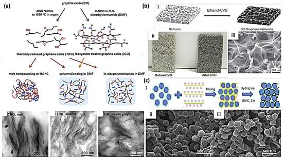 Figure 8. Different fabrication methods for making graphene-polymer composites. (a) Representations of TRG/TPU composite formulation routes and TEM images of TRG in TPU and 3 wt.% TRG/PU composites fabricating processes, revealing the improved dispersion of TRG by solution blending and in situ polymerization as compared to melt mixing [34]. (b) Porous graphene frameworks manufactured by ethanol-CVD method: (i) represents the synthesis diagram of 3D graphene networks on Ni foam by ethanol-CVD, (ii) represents Ni foam before and after the growing of graphene, and (iii) depicts 3D graphene assemblies after elimination of Ni foam [77]. (c) Three-dimensional RGO interaction by a self-assembly method [78]: (i) the self-assembly of PMMA latex and graphene oxide, supported by hydrazine reduction of graphene oxide, and SEM images of RGO-PMMA composites packed with various filler loadings; (ii) 2 wt.%; and (iii) 4 wt.% [14]. Adopted with permission from refs. [14,34,77,78].