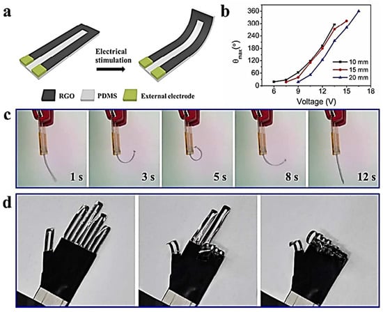 Figure 10. Fabrication of soft actuator with printed RGO electrodes. (a) RGO/PDMS bilayer actuator under electrical stimulation. (b) The maximum bending angle of the actuators as a function of the driving voltage. (c) Digital images of the actuator at various bending angles, with reversible shape change of the actuator. (d) The final look of a hand-shaped actuator with independent fingers controlled by various gestures. Reprinted with permission from ref. [105].