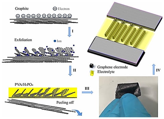 Figure 11. Preparation process of a micro-supercapacitor. (I) Electrochemical exfoliation of graphite foil. (II) Coating the graphene/graphite foil with gel electrolyte (PVA/H3PO4). (III) Peeling off flexible graphene paper-like electrode. (IV) Building of interdigitated micro-supercapacitor devices using the paper-like electrode. Reprinted with permission from ref. [110].