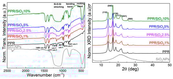 Last, it could be stated that the potential limitation of this work lies in the low chemical affinity that the silica shows with the polyolefins. The SiO2 is hydrophilic, while the PP is highly hydrophobic; yet, the best that could be arranged in this study was applied, i.e.,the silica particles were organicallytreated before incorporation, the particles were ranged in nanoscale, and low concentrations were elaborated for homogenous applications. Plus, a careful meltmixing process was elaborated for satisfactory incorporation (in time/temperature conditions).