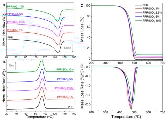In this work, SiO2 nanoparticles were used to reinforce the mechanical and thermal characteristics of the PPR matrix. The nanoparticle-reinforced PPR composites were prepared using meltmixing. Previous reports suggest that high-volume fractions of silica nanoparticles lead to NP agglomerations, which greatly deteriorated the mechanical performance of the composites. Thus, the filler content varied from 1% to a maximum value of 10 wt.%. Differences in the thermal, mechanical and thermomechanical properties of the nanocomposites with the varying silica nanoparticle weight fractions are discussed. The incorporation of organicallytreated nanoparticles in the random polypropylene matrix allows for the formation of some interfacial bonds, which greatly improve the elasticity, toughness and stiffness of the matrix. The thermal degradation only demonstrated a significant improvement with the addition of 10 wt.% NPs, while the melting and cooling behavior of all nanocomposites was similar to that of pure PPR.