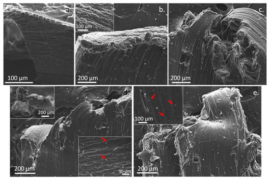 Micrographs of the fracture area of the specimens used during the strain–stress characterization were obtained by SEM, and they are shown in
