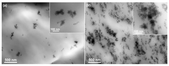 Figure 5a). Increasingthe filler content to 10 wt.% led to the formation of significantly larger agglomerates of more than 500 nm in length, exhibiting an irregular distribution (