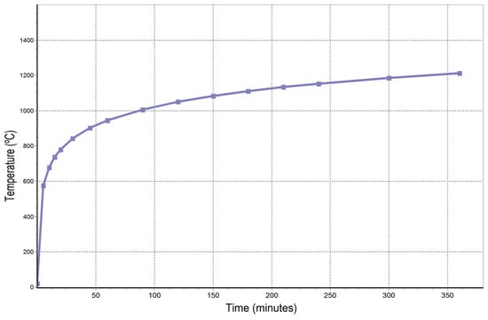 This test is very stringent, as the slope of the curve is very steep. In the first 5 min, the temperature inside the oven reaches 556 °C, and 15 min after the start of the test, the temperature is 721 °C. Subsequently, the temperature rise slows slightly, reaching approximately 1150 °C after 4 h of testing.