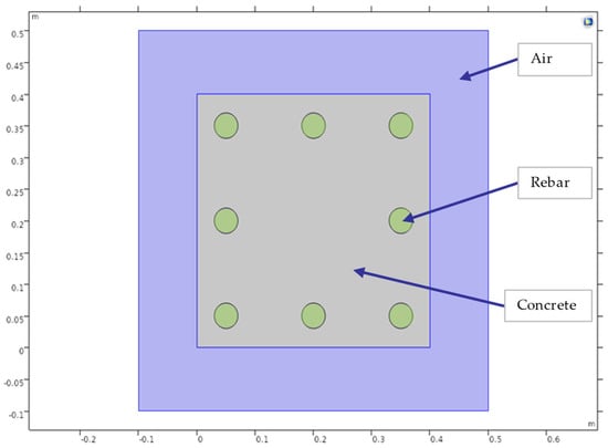 The model was used to simulate the effects of fire on the four faces of a column without any load. The heat focus was situated at 100 mm on each concrete face through an air interface. Two cases that change internal reinforcement, a steel-RC and GFRP-RC column section, have been modelled. The section model is 400 × 400 mm, with a 50 mm cover and 8 ϕ 16 mm as internal reinforcement (Figure 2).