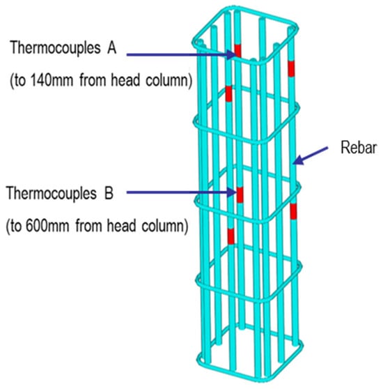 Internal thermocouples have been placed in the columns to obtain the temperature values reached by each of them throughout the test. These internal thermocouples were placed at two different distances from the head of the column to record the changes in the temperature depending on the distance to the focus of the fire load. Location A was positioned 140 mm from the top of the column, and location B was at a distance of 600 mm (Figure 4). There were three internal thermocouples at each location. External thermocouples were also installed on the face of the concrete.