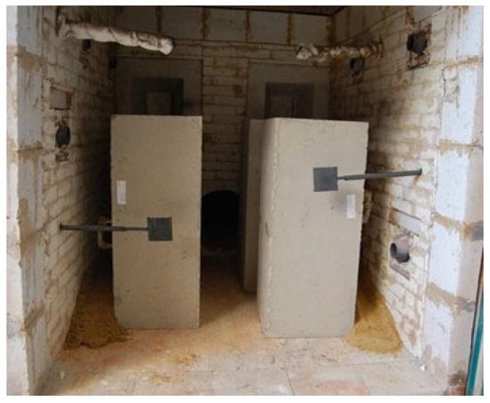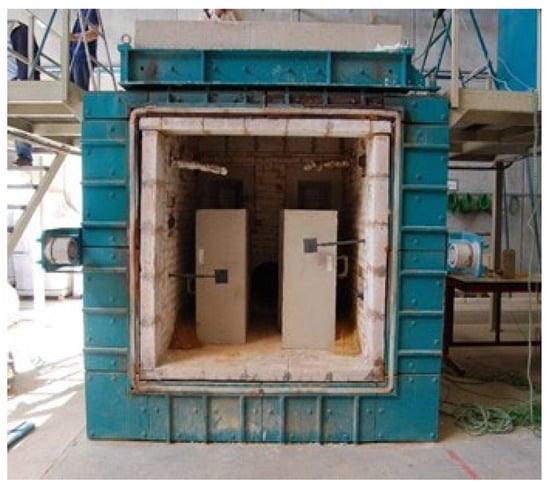 The instrumentation needed to be capable of subjecting the construction elements to the temperature conditions established by the standard and measuring them during the test. A furnace of nominal dimensions 1500 × 1500 × 1500 mm was used. Plate thermocouples were used to record the temperature of the furnace, and a T-sensor with a differential transmitter was used for pressure. To measure the internal temperature of each rebar, a type K thermocouple cable composed of 2 × 0.8 mm solid wires insulated individually and in conjunction with ceramic fibre was used. In addition, four thermocouples were used to record the furnace temperature. The placement of the samples inside the oven can be seen in Figure 5 and Figure 6.