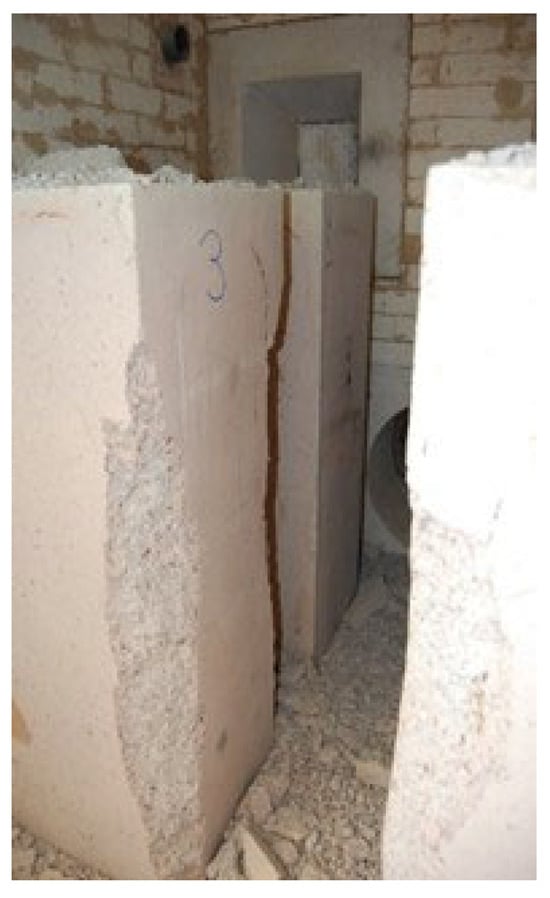 After the test, it was found that some faces of the columns exposed to fire suffered from ‘spalling’ (Figure 7). Small or significant parts of the exposed faces disappeared through detachment, resulting in the loss of the existing reinforcement coating. Consequently, the reinforcement may be directly exposed to heat, losing its load capacity [26].