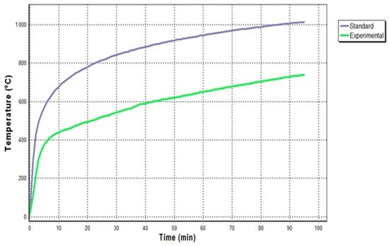 The average temperature recorded by the four thermocouples monitoring the oven was compared with the normalised curve, and a difference of around 300 °C was found between the theoretical and experimental temperatures of the oven throughout the test (Figure 8).