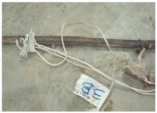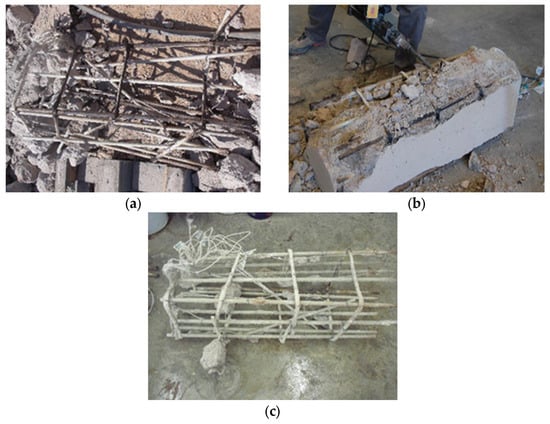 Moreover, when the rebars were recovered by chopping the concrete (Figure 9a–c), the ultimate tensile strength for the reinforcing rebars of the columns was calculated based on a bending test. A simple bending test allowed us to determine the tensile strength of the GFRP rebars with sufficient precision [27] (Figure 10).
