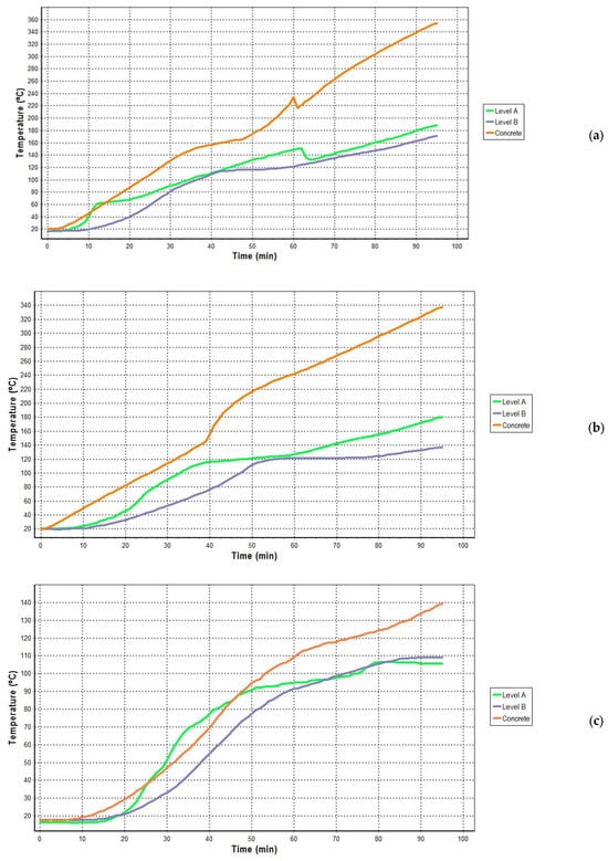For each tested column, there was no substantial difference in the values measured by the thermocouples at levels A and B. Therefore, the height of the heat focus was not a determining variable (Figure 13a–c).