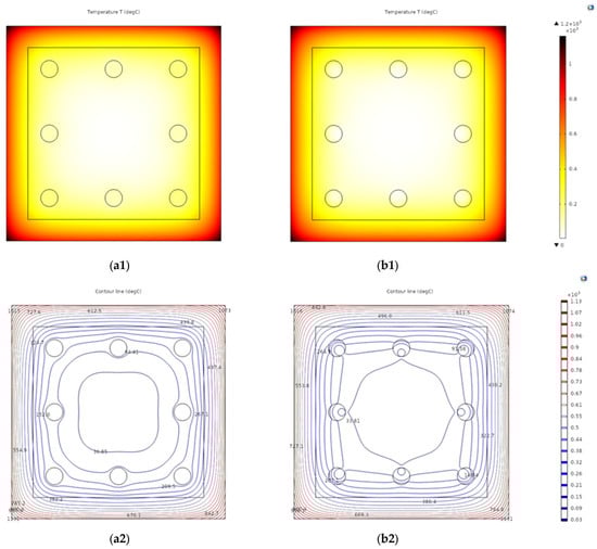 For an exposure time of 60 min, it is possible to compare the theoretical results (Figure 15) with the experimental ones (Figure 13a,b). Table 7 shows the temperature reached by the concrete face and the internal GFRP reinforcement in the theoretical and experimental models. It can be seen that the starting hypothesis of this study is supported.