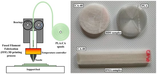 - Lecoublet, M.; Ragoubi, M.; Kenfack, L.B.; Leblanc, N.; Koubaa, A. How Do 3D Printing Parameters Affect the Dielectric and Mechanical Performance of Polylactic Acid–Cellulose Acetate Polymer Blends? J. Compos. Sci. 2023, 7, 492. [Google Scholar] [CrossRef]