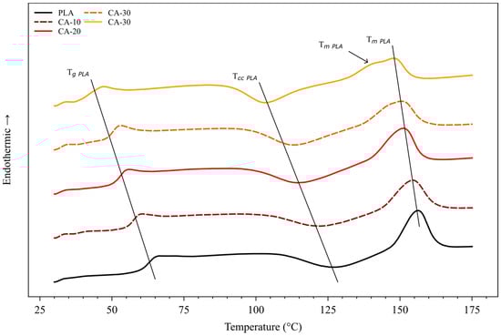 Figure 2 presents the thermal properties of neat PLA and PLA/CA blends. Neat PLA exhibited all the expected relaxations for a PLA: a glass temperature (Tg) of 61.6 °C, a cold crystallization temperature (Tcc) of 126.8 °C, and a melting temperature (Tm) of 156.3 °C [11]. Adding CA decreased all the observed relaxations. At WCA = 40%, the Tg, Tcc, and Tm of PLA decreased by 21.3, 23.9, and 8.5 °C, respectively. Kang et al. have also observed a decrease in Tg by adding plasticizers into PLA [11]. According to the latter, adding plasticizers, generally small molecules, increased the free volume of macromolecular chains, thereby improving the polymer’s mobility. It is also worth noting that the supplied PLA was amorphous, with a measured Xcr below 1%. Furthermore, while adding the plasticizer improved the mobility of the macromolecular chains, it did not significantly change the crystallinity of the blends, with Xcr still below 1%. The only visible change is the presence of a second slight melting peak at around 142 °C, proof that a second crystal lattice appeared.