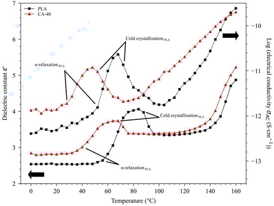 Dielectric constant ε′ and electrical conductivity σAC of PLA and CA-40 versus temperature, measured at 100 Hz. The main arrows indicate the axes of the corresponding curves.