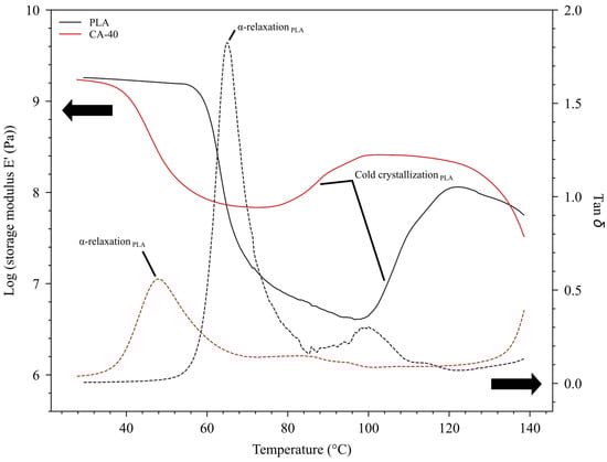 Log (storage modulus E′) and loss tangent tan δ of PLA and CA-40 specimens versus temperature. The main arrows indicate the axes of the corresponding curves.