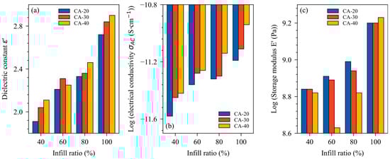 One of the main benefits of 3D printing is the ability to control the infill ratio of 3D specimens. Zhang et al. demonstrated that the dielectric constant was proportionally related to the infill ratio, which can be valuable for producing materials with controlled dielectric properties [15]. To investigate this effect on the mechanical and dielectric properties of PLA/CA blends, Figure 5 shows the ε′, σAC, and E′ of CA-20, CA-30, and CA-40 blends. The ε′ and E′ decreased with a decreasing infill ratio, while the σAC increased with decreasing infill ratio. In the case of CA-40, shifting from 100% to 40%, the infill ratio decreased the dielectric constant and storage modulus by 29% and 61%, respectively. The σAC was, however, increased by 216%. The decrease in ε′ and E′ with a decreasing infill ratio can be directly related to the porosity rate of the samples [15,16,17]. Regarding the variation in the dielectric constant with the infill ratio, two studies in the literature can provide information on the involved mechanism. Figure 6 shows the ε′ versus infill ratio of the work by Zhang et al. and Colella et al., using 3D-printed PLA [15,18]. It can be noted that the theoretical model was linear for both studies. Lowering the infill ratio logically produced less dense samples that were, therefore, less likely to be polarized, as the dielectric constant of air approaches 1 [8]. It is worth noting that linear regression applied to literature data gives a value very close to 1, validating this statement. The increase in the electrical insulating properties associated with the reduction in the infill ratio can be linked to more conductive paths, enabling the electrical current to bypass areas of high local resistance due to greater local heterogeneity. These results demonstrate that improving the insulating properties of PLA/CA blends would be possible by reducing the infill ratio at the cost of lower mechanical stiffness.