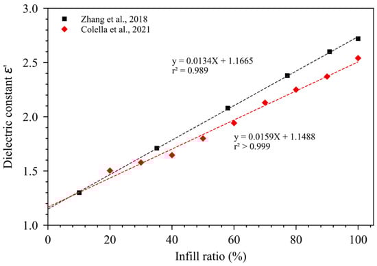 Dielectric constant ε′ versus infill ratio of 3D-printed PLA [15,18].