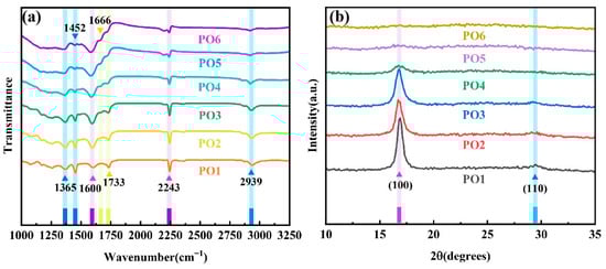 Figure 1a,b display typical infrared and XRD spectra of six pre-oxidized fibers within the 3250–1000cm−1 region across different temperature ranges. Figure 1a shows several typical functional group structures in the pre-oxidation process; 1600 cm−1 denotes the stretching vibration peak of C=N in cyclization PAN, and 2243 cm−1 denotes the stretching vibration peak of C≡N; 1365 cm−1, 1452 cm−1, and 2939 cm−1 correspond to the C-H bending vibration peak in -CH, the C-H symmetric bending vibration peak in -CH2, and the C-H symmetric extension vibration peak in -CH2. The peaks at 1666 cm−1 and 1733 cm−1 denote the stretching vibration peaks of C=O [,,,]. During pre-oxidation, the peak intensity at C=N increased and the peak intensity at C≡N decreased with increasing temperature, indicating that the PAN linear molecular chain produced cyclized cross-links and gradually changed to a stable trapezoid structure. The peak strength of -CH increased and that of -CH2 decreased, indicating that -CH2 transformed to -CH and dehydrogenation occurred. In addition, the stretching vibration peak at C=O was continuously enhanced, indicating that the occurrence of the oxidation reaction was related to the formation of the ring-conjugated carbonyl structure.