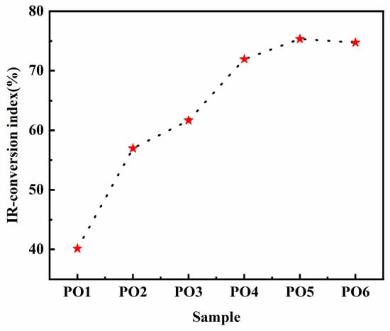 The infrared conversion index of the pre-oxidized fiber, obtained from Figure 1a from the FTIR spectrum of the pre-oxidized fiber and Equation (3), is shown in Figure 2. The change in its value represents the transformation of the nitrile-based structure to the conjugated structure, that is, the cross-linked cyclization of the PAN linear molecular chain into a trapezoidal polymer. In the initial stage of pre-oxidation, the structural transformation was faster, and the infrared transformation index reached about 75% in the first four temperature regions of pre-oxidation. The magnitude of the transition subsequently decreased. In general, the polyacrylonitrile structure was mostly transformed into a cyclized and cross-linked trapezoid structure at about 260 °C in the fourth temperature region of pre-oxidation.