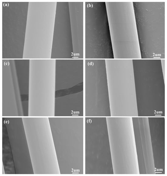 Figure 3a–f shows the surface SEM morphology of the pre-oxidized fibers. The surfaces of the pre-oxidized fibers in the first to sixth temperature zones were smooth, without obvious defects and grooves, and the diameters of the fibers from PO1 to PO6 were about 8 μm each.