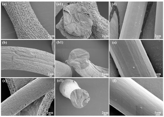 DMSO dissolved the fibers in two stages: swelling followed by dissolution. The DMSO solution first diffused into the interior of the fiber, causing its volume to increase and swell. Then, with the solvent increase, the interior began to dissolve. Figure 4 shows the SEM surface morphology and partial cross-sectional morphology of the pre-oxidized fibers after ultrasonic etching in 98 wt% DMSO solution for 15 h; it shows the morphological changes of the pre-oxidized fibers after ultrasonic etching. Compared with the untreated fibers (Figure 3), the surface of the etched pre-oxidized fibers shows folds and the diameter is significantly larger, which is due to the chemical structural changes of PAN protofilaments after pre-oxidation, where the intermolecular force is weakened, and the solvent is diffused into the fiber interior. In the later stages of pre-oxidation, the cortex of the pre-oxidized fibers became relatively dense due to the oxidation and cyclization reactions between molecules. It was difficult for the solvent to diffuse into the fiber interior, resulting in less increase in the fiber diameter. Figure 4(a1–c1) show the cross-sectional morphology of the fiber in the three temperature zones before the pre-oxidation heat treatment. It could be seen that with the increase in the treatment temperature, the influence of the solvent on the inside of the fiber gradually decreased, indicating that the fiber became more compact. The fracture morphology gradually shifted from ductile to brittle, and the fracture surface gradually flattened. After the fourth temperature zone, the fibers became denser, and almost no fibers were broken.