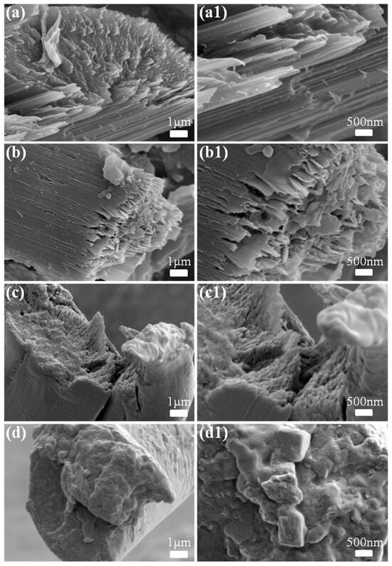 Figure 5 shows the cross-sectional morphology of the pre-oxidized fibers in the first to the fourth temperature zones, broken by stretching. As shown in Figure 5(a,a1), when the pre-oxidized fibers in the first temperature zone were ‘pulled off’, many longitudinal lamellar microfibers extended along the stretching direction, and a large number of microfibers on the surface and in the inner layers of the fibers were extended, while some small transverse microfibers could also be observed. In Figure 5(b,b1), it could be observed that there was also a large number of lamellar structures when the pre-oxidized fibers in the second temperature zone were ‘pulled off’. The extension length of microfibers in both the fiber cortex and inner layer was similar but shorter than that in the first temperature zone. This indicated that the connections between microfibers gradually strengthened with the increase in the pre-oxidation heat treatment temperature. As shown in Figure 5(c,c1), the pre-oxidized fibers in the third temperature zone became denser, and almost no lamellar microfibers in the fiber cortex were stretched or extended when the fiber was ‘pulled off’; only the relatively weak microfibers in the inner layer of the fiber extended when stretched. Figure 5(d,d1) display the tensile fracture morphology of the pre-oxidized fiber in the fourth temperature zone. At this time, the pre-oxidation temperature was already high, the microfibers in the outer and inner layers of the fiber were (almost) neither stretched nor extended, and the connections between the microfibers had become very dense. It could be seen that the fracture morphology of the fiber changes from ductile to brittle, as well as the cross-section, became relatively flat.