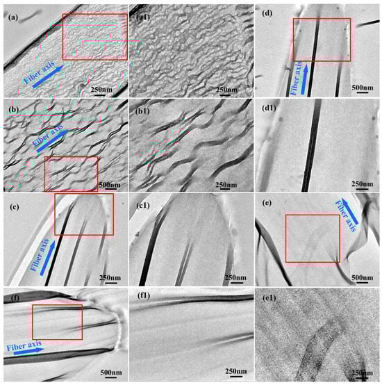 Figure 6 shows the HRTEM morphology of the ultra-thin section of the first to the third temperature zones of the pre-oxidized fiber after etching with 92 wt% DMSO solution for 2 h. Figure 6a–f present a low-magnification view of the section of the first to the sixth temperature zones, with the blue arrow denoting the fiber axis orientation; Figure 6(a1–f1) shows an enlarged view of the local area within the red wireframe in Figure 6a–f.
