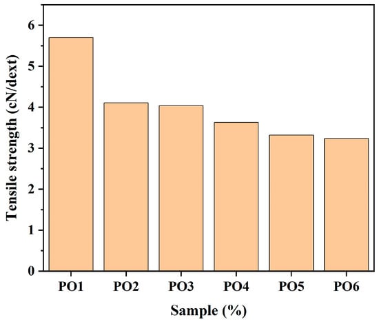As shown in Figure 7 and Table 2, the tensile strength of the pre-oxidized fiber decreased continuously from the first to the sixth temperature zones. The tensile modulus decreased gradually. Elongation at the break increased continuously and decreased in the sixth temperature zone. During the pre-oxidation process, XRD and FTIR analyses indicated that with the pre-oxidation treatment temperature increase, the nitrile group changed into the conjugated group, and the molecular cohesion decreased, leading to a decrease in tensile strength and tensile modulus. However, the crystalline size of the fiber gradually decreased, and the amorphous area increased, resulting in enhanced fiber ductility and, therefore, increased elongation at break. When the fiber reached the sixth temperature zone, the rigidity increased and the elongation at break decreased.