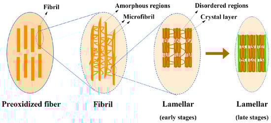 The lamellar structure in the protofilament was inherited inside the pre-oxidized fibers. Microfibrils are composed of lamellae stacked along the fiber axis, in which ordered crystal layers and disordered regions are arranged alternately, and disordered regions are etched away by a DMSO solution during dissolution etching.