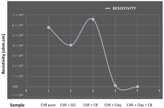 The effect of nanoclay on the electrical resistivity of various polymer matrices has already been studied [67,68]. From the results, a sharp drop in resistivity is observed for CIIR–clay-based composites and the hybrid composites with nanoclay and CB. Similar observations were reported by Rashmi et al. in a study based on Montmorillonite nanoclay filler effects on the electrical conductivity of epoxy-based nanocomposites [69]. Experimental results showed that the inclusion of 2 wt% MMT nanofiller increased the Tg, electrical conductivity, thermal stability, modulus, and free volume of the epoxy nanocomposite significantly.