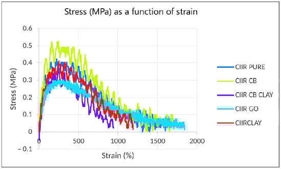 The stress–strain curve is given in Figure 4. The CB-filled system showed the highest tensile strength (TS) (Figure 4). CB–clay hybrid fillers in CIIR composites have enabled dramatic synergistic reinforcing concerning the modulus (Figure 4 and Table 4), although the TS is lower.
