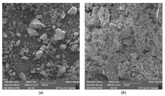 The microstructure of particles of crushed perlite and samples of perlite-based geopolymer with different mineral modifiers was studied using scanning electron microscopy (SEM). A scanning electron microscope (Tescan, Czech Republic) operated in the high vacuum mode (InBeam) with a high-brightness Schottky cathode applied. Before analysis, all test samples were pre-coated with a thin layer of chrome (Cr) for better conductivity.