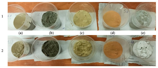 Appearance of perlite-based geopolymer pastes with different mineral modifiers after curing in ambient conditions: (a) PGP; (b) P-PC; (c) P-K; (d) P-MK; (e) P-CG. 1—fresh alkali solution; 2—24 h conditioned alkali solution. Note: this image was made 30 min after molding procedure.