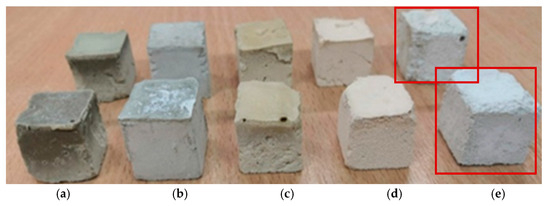 Appearance of perlite-based geopolymer pastes with different mineral modifiers after thermal treatment at 70 °C: (a) PGP; (b) P-PC; (c) P-K; (d) P-MK; (e) P-CG. Upper level—fresh alkali solution; lower level—24 h conditioned alkali solution.