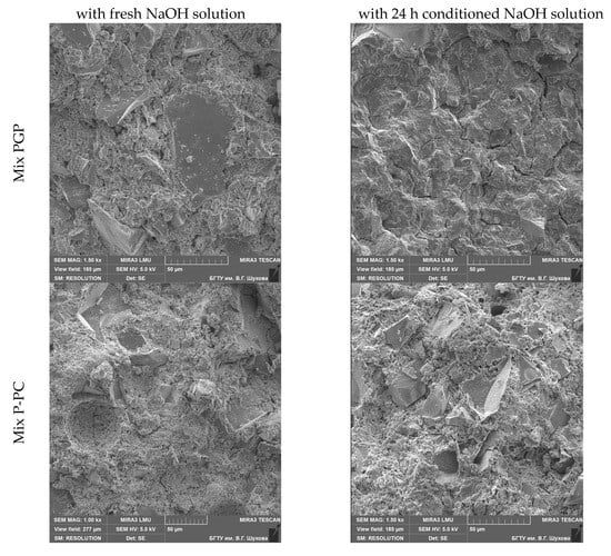 The microstructures of the P-PC mix obtained using both methods of NaOH introduction, fresh and 24 h conditioned ones, are identical to each other, despite the presence and different contents of surface efflorescence components for samples using 24 h conditioned alkali solution (Figure 4).