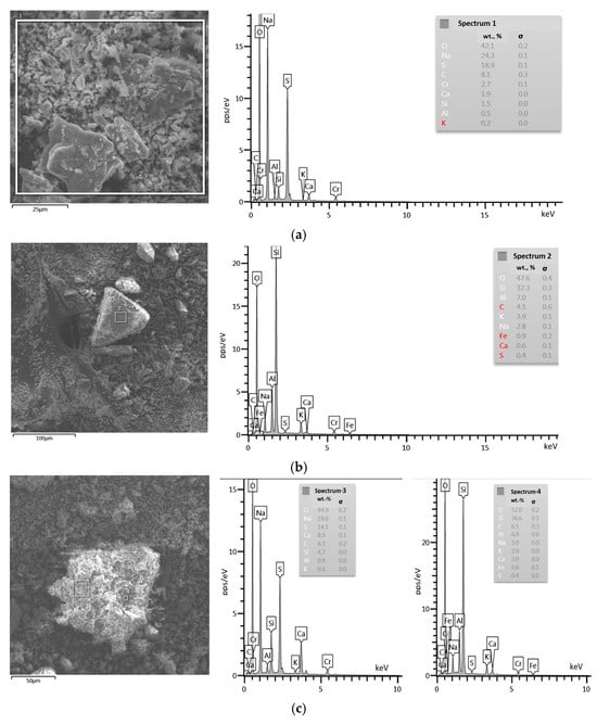 The efflorescence component from the P-CG mix, cured with thermal treatment at 70 °C, also contains Na2SO4 (Figure 8c, Spectrum 3), as well as Si and Al elements associated with perlite (Figure 8b, Spectrum 2). The presence of an aluminosilicate component in the efflorescence substance may be a confirmation of the ineffective occurrence of geopolymerization processes, which leads to the presence of unreacted raw material components in the system, as well as the formation of a weaker geopolymer matrix, in accordance with the compressive strength data, depicted in Figure 3.