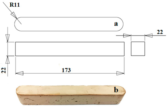 The control sample was prepared by molding the slurry as received in the metallic die presented in Figure 1a using a compression load of 350 N. It results in a bar with rectangular section suitable for flexural testing, Figure 1b. The moisture of the received slurry was measured as being about 25%.
