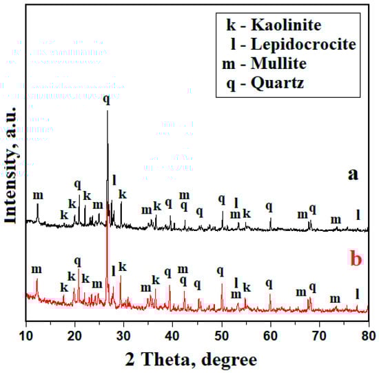 The initial sample, T0, has a well-developed XRD pattern presented in Figure 2a. Strong diffraction peaks are observed, having large intensity and a narrow aspect accompanied by several less intense peaks with slightly broadened width. This corresponds to a complex mixture of crystalline phases in which some of them have very small particles. The composition of the T0 sample is dominated by quartz, followed by kaolinite, mullite, and traces of lepidocrocite.