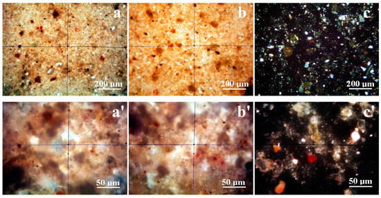 Mineralogical optical microscopy images observed at 300× magnification for the samples (a) T0, (b) T3, (c) water particulate dispersion and 1200× magnification for the samples (a’) T0, (b’) T3, (c’) water particulate dispersion.