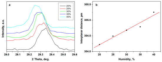 The moisture influence on the kaolinite matrix is clearly evidenced by the MOM observations. It requires an additional investigation regarding water’s influence on its crystalline structure. Therefore, the samples with controlled humidity were exposed to XRD investigation towards the 29.0 to 29.6 range of 2 theta angles to observe the position of the diffraction peak generated by the crystallographic plane having the Miller indices (−112) regarding PDF 02-0105. We observed peak position displacement to the lower angle position with the moisture increasing, Figure 4a.