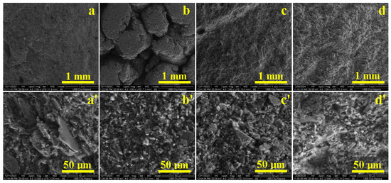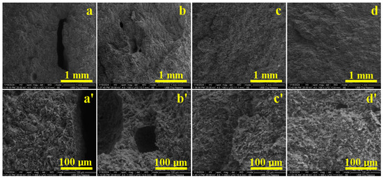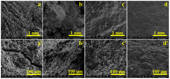 Sample microstructural aspects evidenced by SEM microscopy: (a,a’) T0, (b,b’) T1, (c,c’) T2 and (d,d’) T3. T0, T1, T2 and T3 are the indicatives of the samples on which the SEM images were obtained.