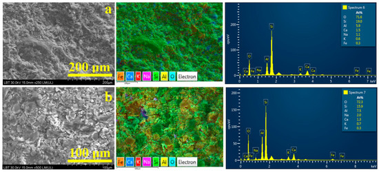 The association between high-speed milling at 6000 rpm and alkaline moisture (technological water for the ceramic tile fabrication having pH = 10) in T3 assures a sustainable reticulation of the kaolinite fine particles that are organized into a dense matrix embedding bigger mineral fractions such as quartz and mullite, Figure 5d. The obtained material is uniform and without pores. The high-magnification investigation in Figure 5d’ reveals an advanced milling of the bigger kaolinite particles that are chopped into small fractions ranging from 1 to 10 μm that surround the quartz and mullite particles in a dense manner. The advanced binding behavior is capacitated by the ultra-structural fractions of about 55 nm evidenced by the XRD determination. Therefore, T0 and T3 samples were subjected to an advanced SEM investigation with elemental analysis, Figure 6.