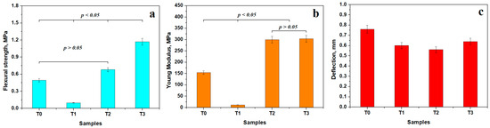 The test sample bars (T series) were subjected to the three-point bending test for assessing their flexural behavior. The test was conducted on three distinct specimens for each sample, and the obtained mean values are centralized in Figure 7; the standard deviation is represented as error bars.
