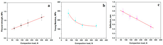 The S series’ flexural strength strongly depends on the compaction load as observed in Figure 9a. A linear increase in the flexural strength along with the pressing load. The S1 sample has the minimum mean value of the flexural strength of about 0.56 MPa while S4 has the maximum mean value situated at 1.17 MPa. The bending Young’s modulus presents an exponential decrease with the compaction load, Figure 9b. The S1 sample exhibits the higher bending elastic modulus (mean value 275.96 MPa) due to the relative flexible bonding within the kaolinite matrix particles. It decreases exponentially due to the kaolinite matrix binding enhancement as a consequence of pressing compaction. Thus, S4 has the lower bending elastic modulus, having a mean value of about 137.05 MPa. The bar deflection under bending effort has a linear decrease tendency, proving that higher compaction grade generates a stiffer material.