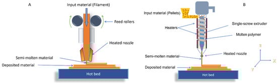 Diagrams showing 3D printing techniques with (A): the FFF principle and (B): the DPAM principle as a representation of the conventional single-screw extruder (SSE) system.