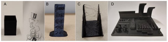 Optimization tests to define the optimal FFF printing parameters. (A): Printing temperature tests, (B): printing speed tests, (C): filament retraction tests, and (D): a complete printed benchmark part using predetermined settings.